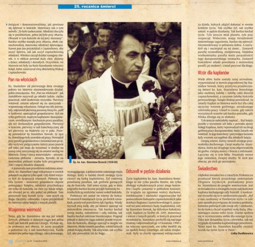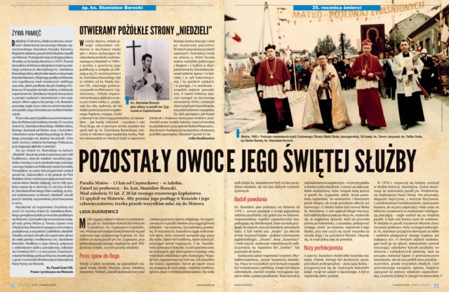 W związku z 25 rocznicą śmierci ks. Stanisława Boreckiego i odsłonięciem tablicy pamiątkowej Jego pamięci podczas Wielkanocnej Mszy Św. Rezurekcyjnej, w ostatnim czasie ukazały się dwa piękne artykuły w ogólnopolskim tygodniku katolickim „NIEDZIELA”. Ich autorką jest Lidia Dutkiewicz, Redaktor Naczelna „NIEDZIELI”.