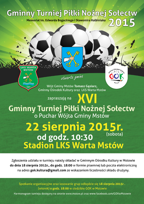 Zgłoszenia udziału w turnieju należy składać w GOK-u w Mstowie do dnia 18 sierpnia (wtorek) do godz.18:00 – wtedy też odbędzie się spotkanie kierowników drużyn oraz losowanie grup.
