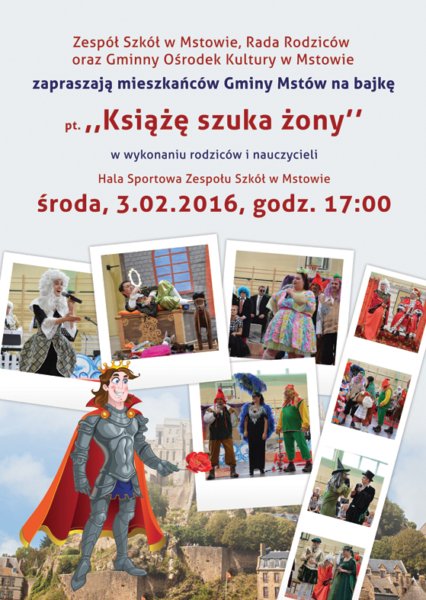 Zespół Szkół w Mstowie, Rada Rodziców oraz GOK zapraszają mieszkańców na bajkę pt. „Książę szuka żony - NA BIS” w wykonaniu rodziców i nauczycieli. Termin: środa 03.02, godz.17, Hala Sportowa w Mstowie.