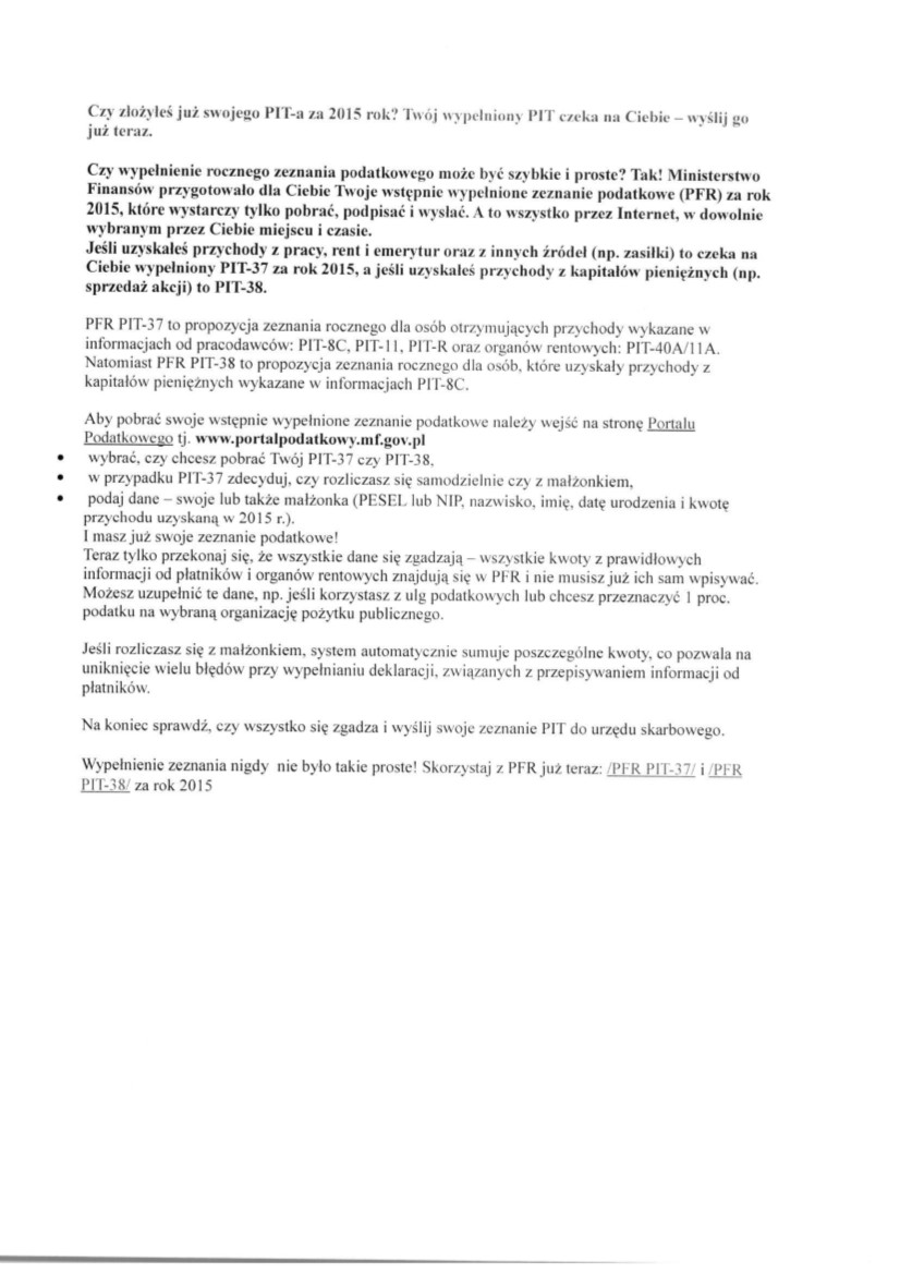 Czy złożyłeś już swojego PIT-a za 2015 rok? Twój wypełniony PIT czeka na Ciebie na stronie Portalu Podatkowego Ministerstwa Finansów – wyślij go już teraz.