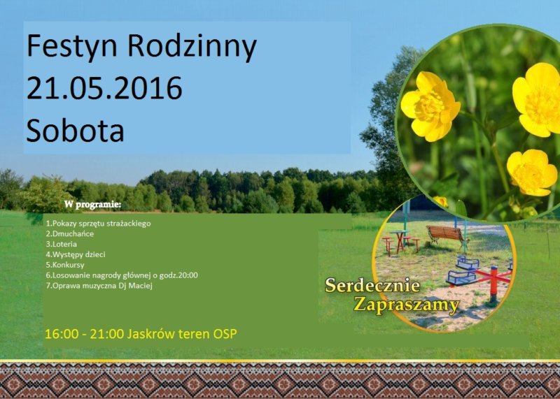 1. Zaczynamy już w sobotę (21 maja) – w Jaskrowie na terenie OSP odbędzie się Festyn Rodzinny. W programie m.in.