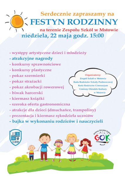 2. W niedzielę 22 maja odbędzie się Festyn Rodzinny na terenie Zespołu Szkół w Mstowie.