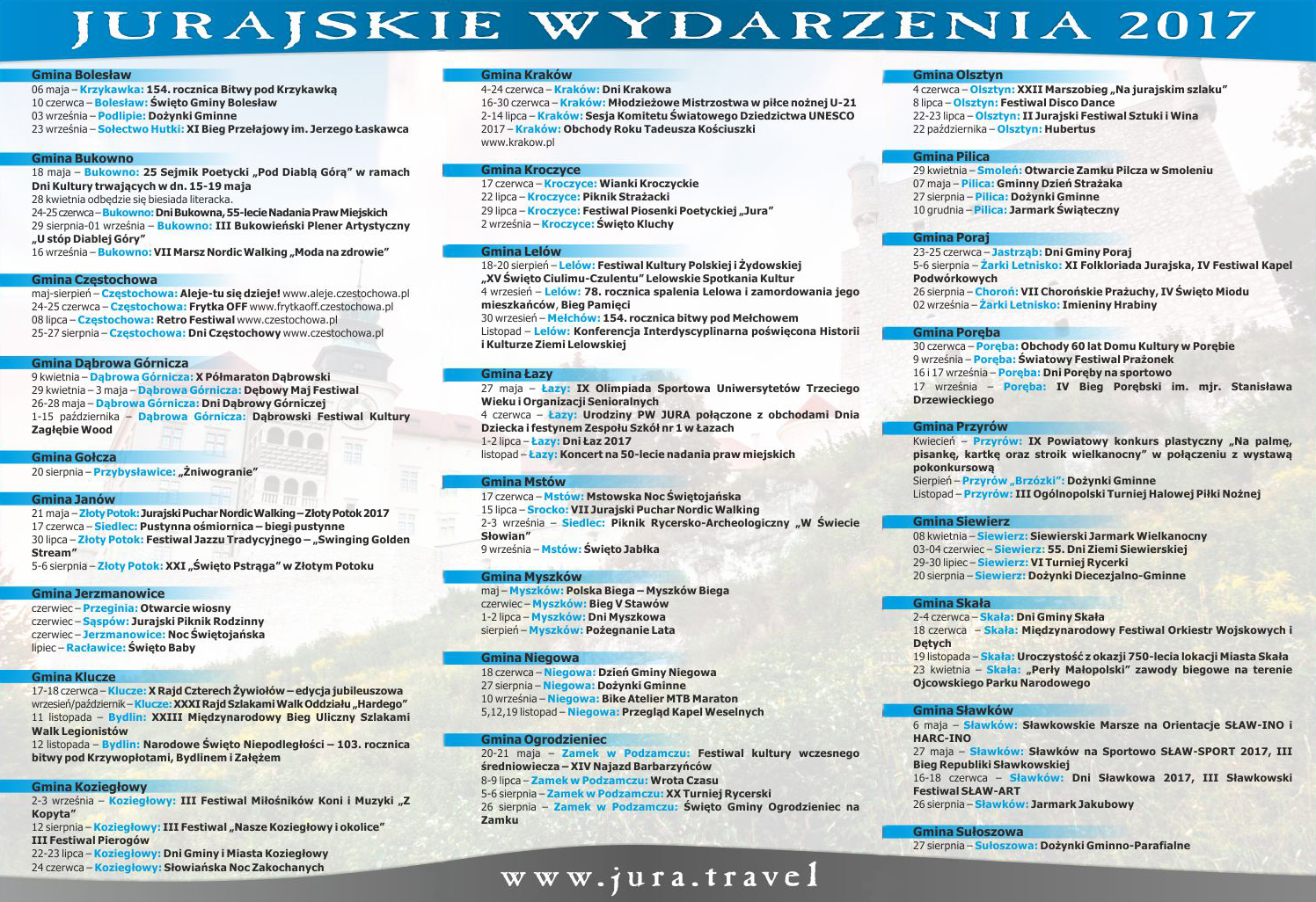 Związku Gmin Jurajskich przygotował „Kalendarium wybranych imprez na Jurze w 2017 roku”, gdzie każda z gmin członkowskich mogła zgłosić max.4 najważniejsze planowane wydarzenia w tym roku.