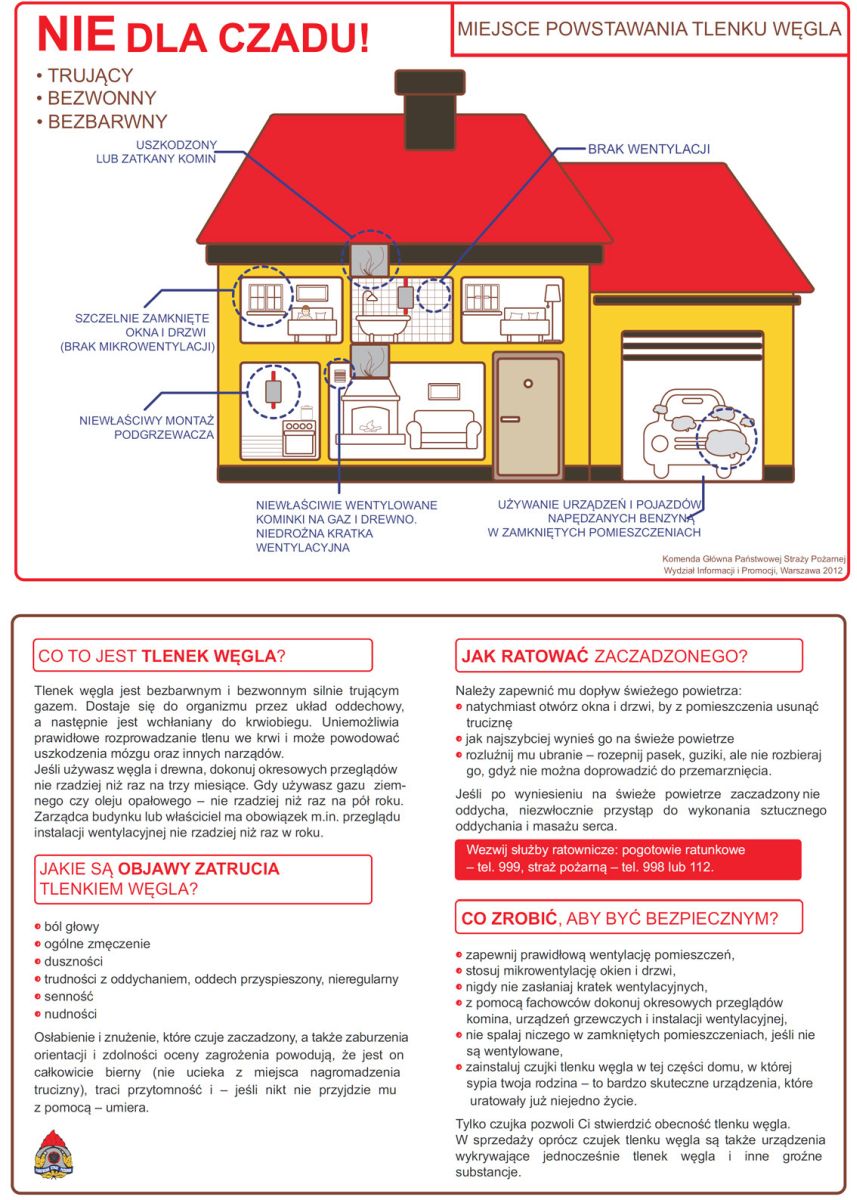 - W związku z tym groźne są zapchane lub nieszczelne przewody kominowe oraz uszkodzone połączenia między kominami i piecami. Szczelnie pozamykane okna (czasami jeszcze dodatkowo uszczelnione), pozaklejane kratki wentylacyjne, brak otworów wentylacyjnych w drzwiach łazienkowych, jak również brak regularnych kontroli drożności przewodów wentylacyjnych i kominowych sprawiają, że w naszych mieszkaniach lub domach możemy nie być bezpieczni. W niewietrzonych pomieszczeniach bardzo łatwo może dojść do tragedii.