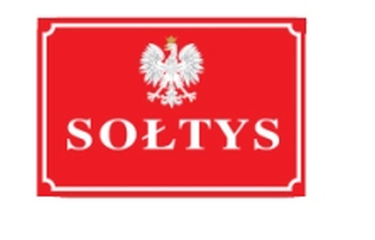 Na czerwonym tle umieszczone jest godło Polski oraz napis „SOŁTYS”. Wydruk UV daje maksymalną odporność na warunki atmosferyczne, a w szczególności promienie słoneczne.