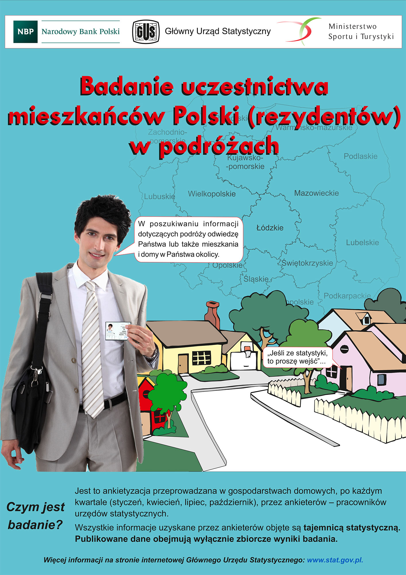 Uprzejmie informujemy, że w dniach od 1 do 20 lipca 2017 r. na terenie całego kraju w wylosowanych mieszkaniach zostanie przeprowadzone badanie reprezentacyjne, dotyczące uczestnictwa mieszkańców Polski w podróżach.