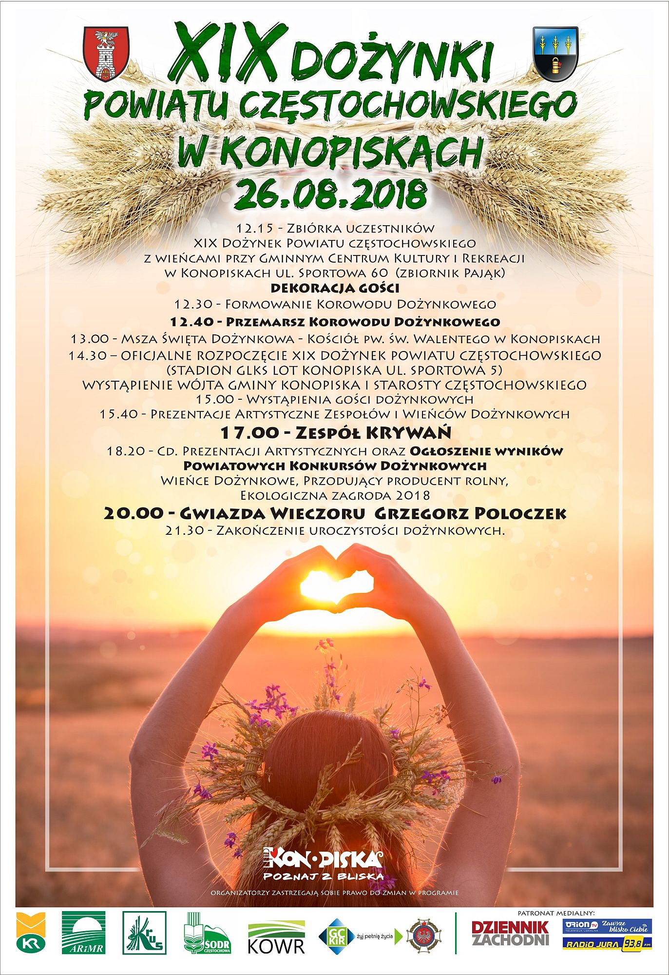 W niedzielę 26 sierpnia, do Konopisk przybędą delegacje z całego Powiatu Częstochowskiego, by wspólnie świętować tegoroczne Święto Plonów. Barwny korowód dożynkowy wyruszy spod siedziby GCKiR, by paradnie przemaszerować ulicami Konopisk do kościoła pw. św. Walentego.