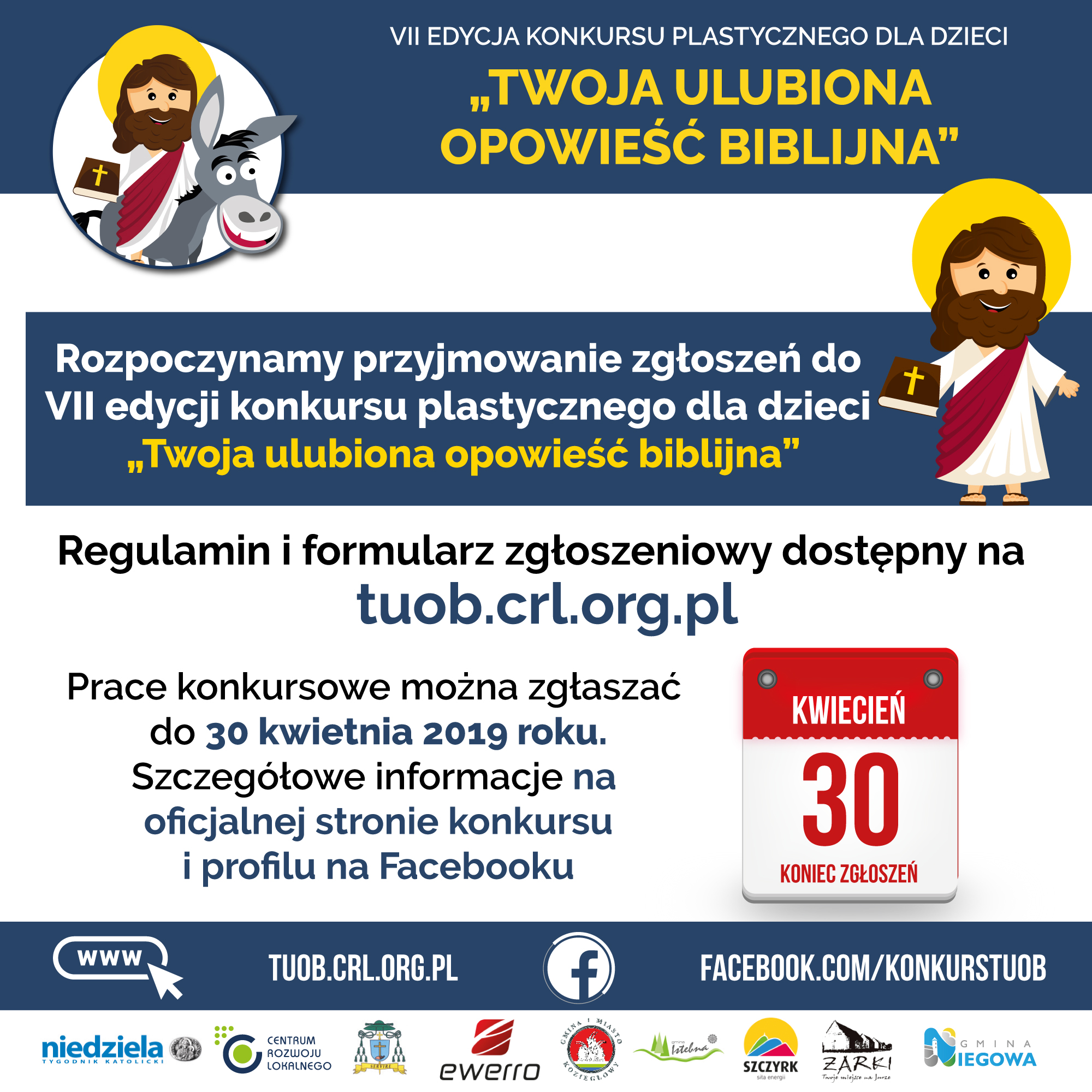Centrum Rozwoju Lokalnego we współpracy z Tygodnikiem Katolickim "Niedziela" i wydawnictwem Ewerro sp. z o.o. zaprasza do udziału w VII edycji ogólnopolskiego konkursu plastycznego dla dzieci pn. "Twoja ulubiona opowieść Biblijna". Konkurs adresowany jest do dzieci w wieku 4-13 lat z całej Polski.