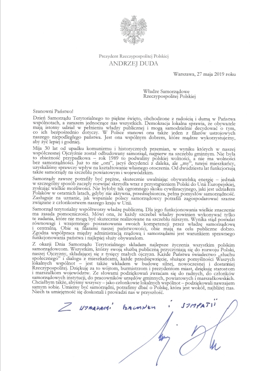 Z okazji Dnia Samorządu Terytorialnego Prezydent Rzeczypospolitej Polskiej Andrzej Duda skierował do Władz Samorządowych RP okolicznościowe przesłanie i życzenia. W załączniku list Pana Prezydenta.