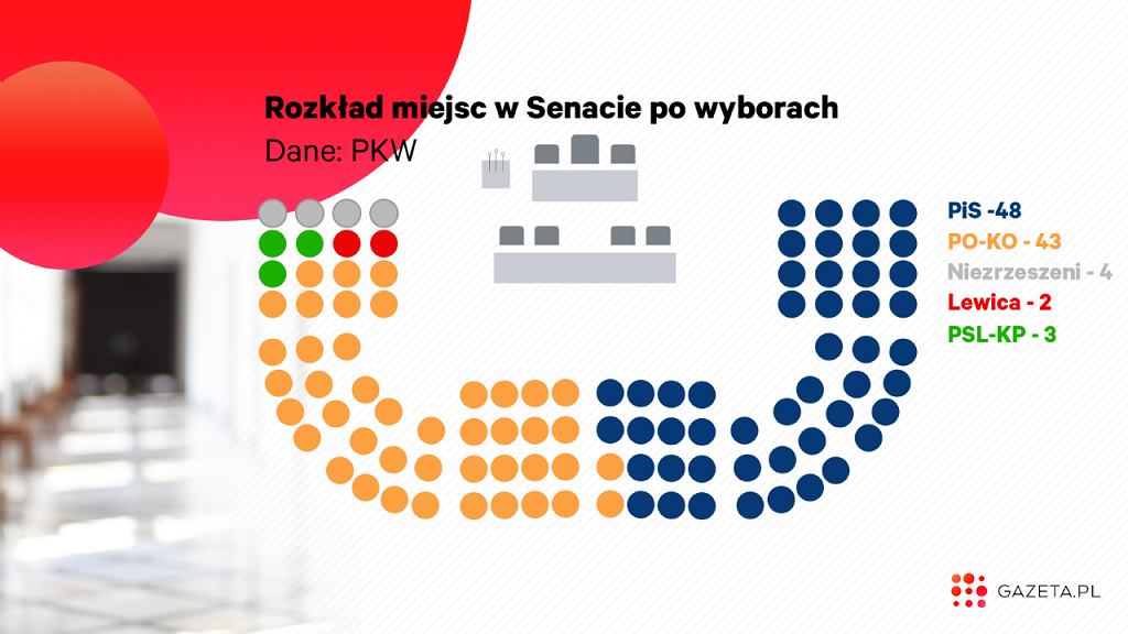 W wyborach do Senatu Prawo i Sprawiedliwość zdobyło 48 mandatów, Koalicja Obywatelska - 43, Polskie Stronnictwo Ludowe 3, a Sojusz Lewicy Demokratycznej - 2. Jest też czwórka senatorów, którzy zdobyli mandaty startując z własnych komitetów.