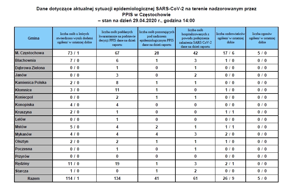 Na terenie miasta Częstochowy i powiatu częstochowskiego stwierdzono 114 przypadków zakażenia [73-Częstochowa (4 zgony), 41-powiat częstochowski). 41 osób podlega nadzorowi epidemiologicznemu, a 134 osoby podlegają kwarantannie domowej. 61 osób z terenu miasta Częstochowa i powiatu częstochowskiego jest hospitalizowanych z powodu podejrzenia zakażeniem SARS CoV – 2. Liczba osób, które wyzdrowiały: 26.