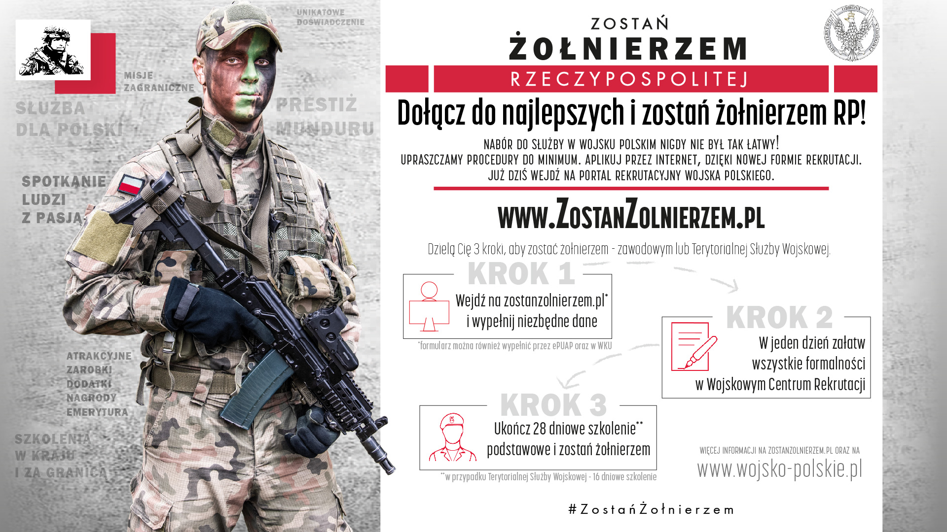 - Portal rekrutacyjny www.zostanzolnierzem.pl - oprócz tradycyjnego składania wniosków do Wojskowych Komend Uzupełnień, uruchamiono rekrutację w formie elektronicznej - za pośrednictwem Portalu Rekrutacyjnego do Wojska Polskiego. Będzie to kolejna, obok ePUAP, elektroniczna forma aplikowania do wojska. Kandydat do służby wojskowej, który nigdy nie był w wojsku, maksymalnie w 14 dni od złożenia wniosku elektronicznego na portalu zostanzolnierzem.pl otrzyma informację, kiedy i w którym Wojskowym Centrum Rekrutacji ma się stawić, aby dopełnić formalności i przejść wymagane badania.