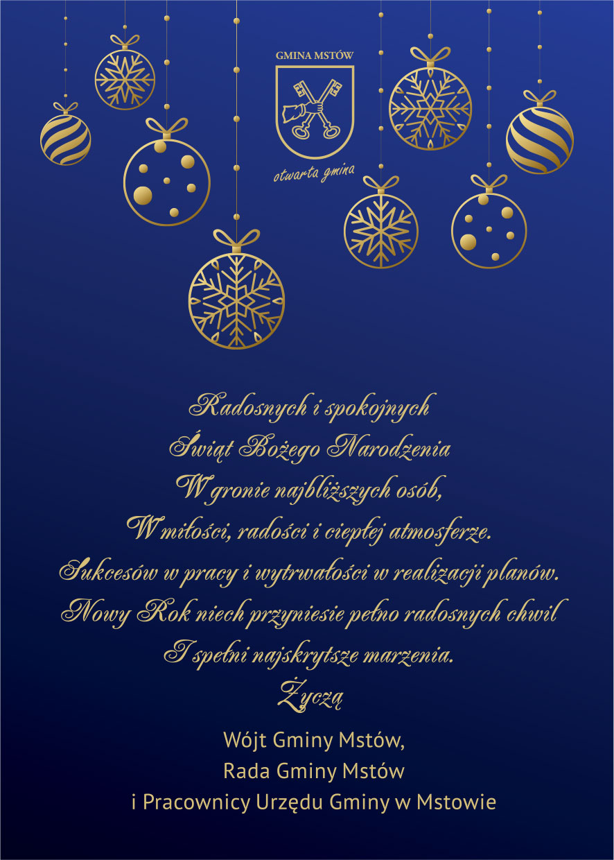 Radosnych i Spokojnych Świąt Bożego Narodzenia oraz wszelkiej pomyślności w Nowym Roku życzą: Wójt Gminy Mstów, Rada Gminy i Pracownicy Urzędu Gminy w Mstowie.