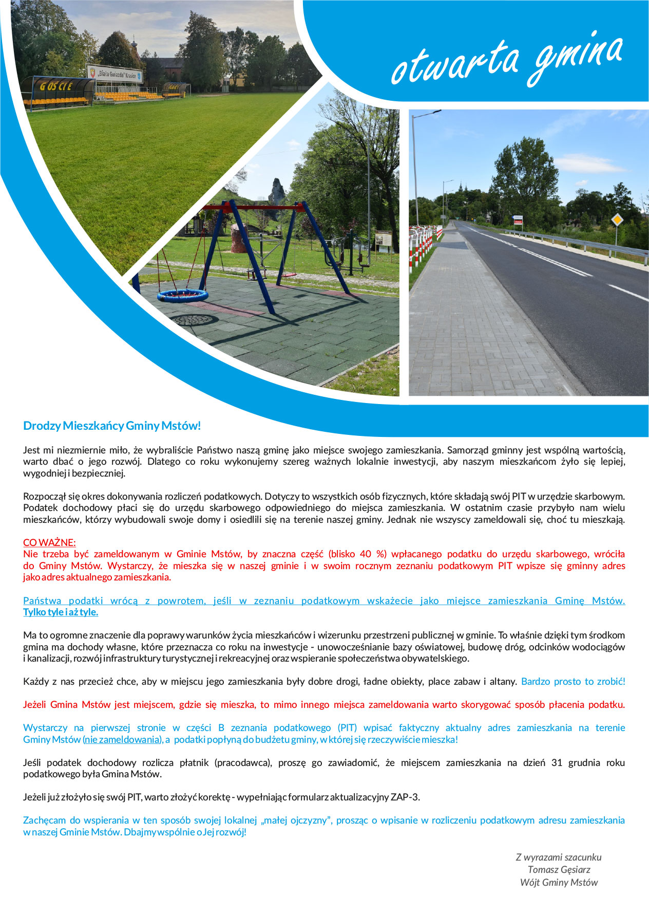 Państwa podatki wrócą z powrotem, jeśli w zeznaniu podatkowym wskażecie jako miejsce zamieszkania Gminę Mstów. Tylko tyle i aż tyle. Wystarczy na pierwszej stronie w części B zeznania podatkowego (PIT) wpisać faktyczny aktualny adres zamieszkania na terenie Gminy Mstów (nie zameldowania), a podatki popłyną do budżetu gminy, w której się rzeczywiście mieszka!