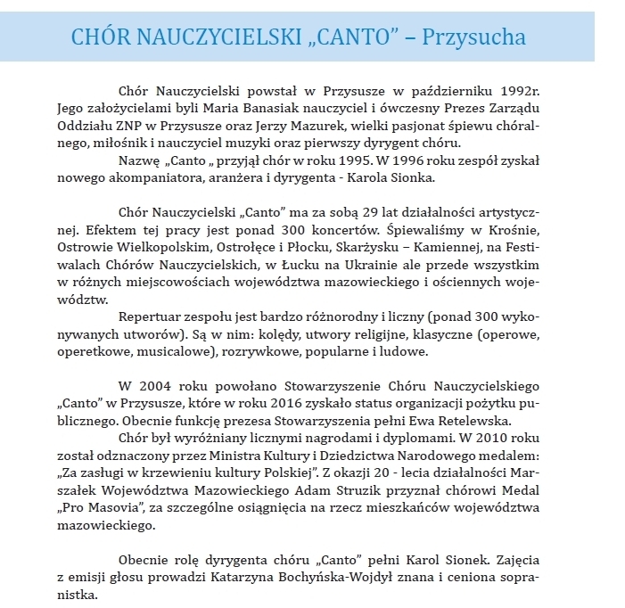 W ramach XI Międzynarodowego Festiwalu Chóralnej Pieśni Maryjnej w niedzielę 29 sierpnia w Kościele w Mstowie (po mszy św. o godz.11) wystąpi Chór Nauczycielski „CANTO” z Przysuchy.