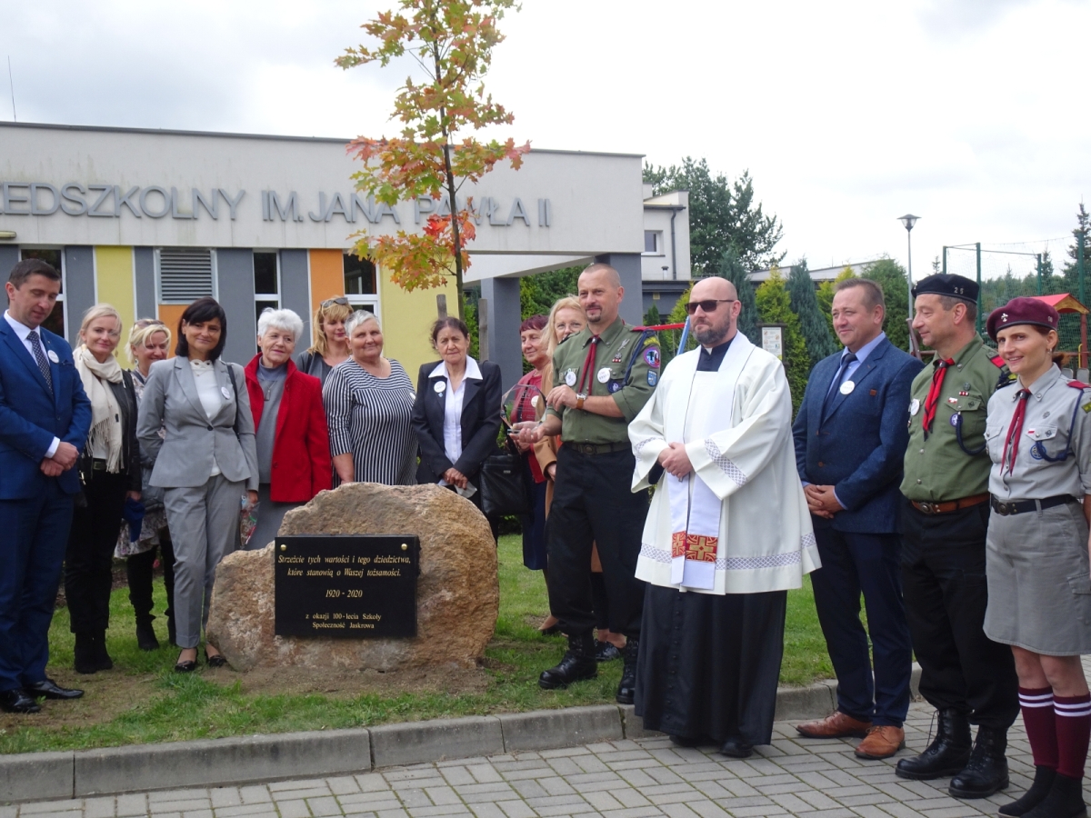 Uroczystość rozpoczęła się od odsłonięcia pamiątkowej tablicy, usytuowanej przed wejściem do budynku szkoły. Umieszczono ją w sąsiedztwie dębu, który został posadzony w 2020 r. Zaproszeni goście mogli też podziwiać boisko szkolne z trawiastą nawierzchnią, które odnowiono na jubileusz 100-lecia szkoły. Następnie goście udali się na salę gimnastyczną (również odnowioną w 2020 r.), gdzie obejrzeli film o historii szkoły oraz podziwiali występy uczniów. Na zakończenie apelu uczniowie wraz z nauczycielami zaśpiewali „Hymn Rodziny Szkół im. Jana Pawła II”.