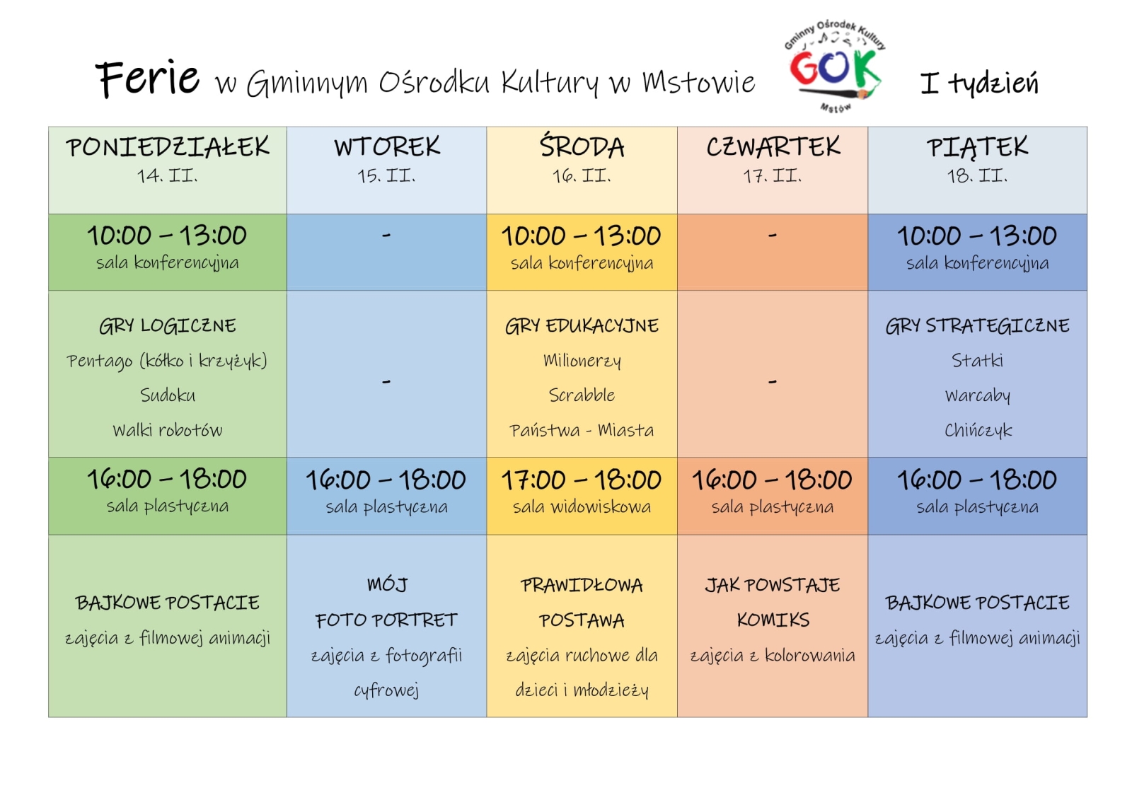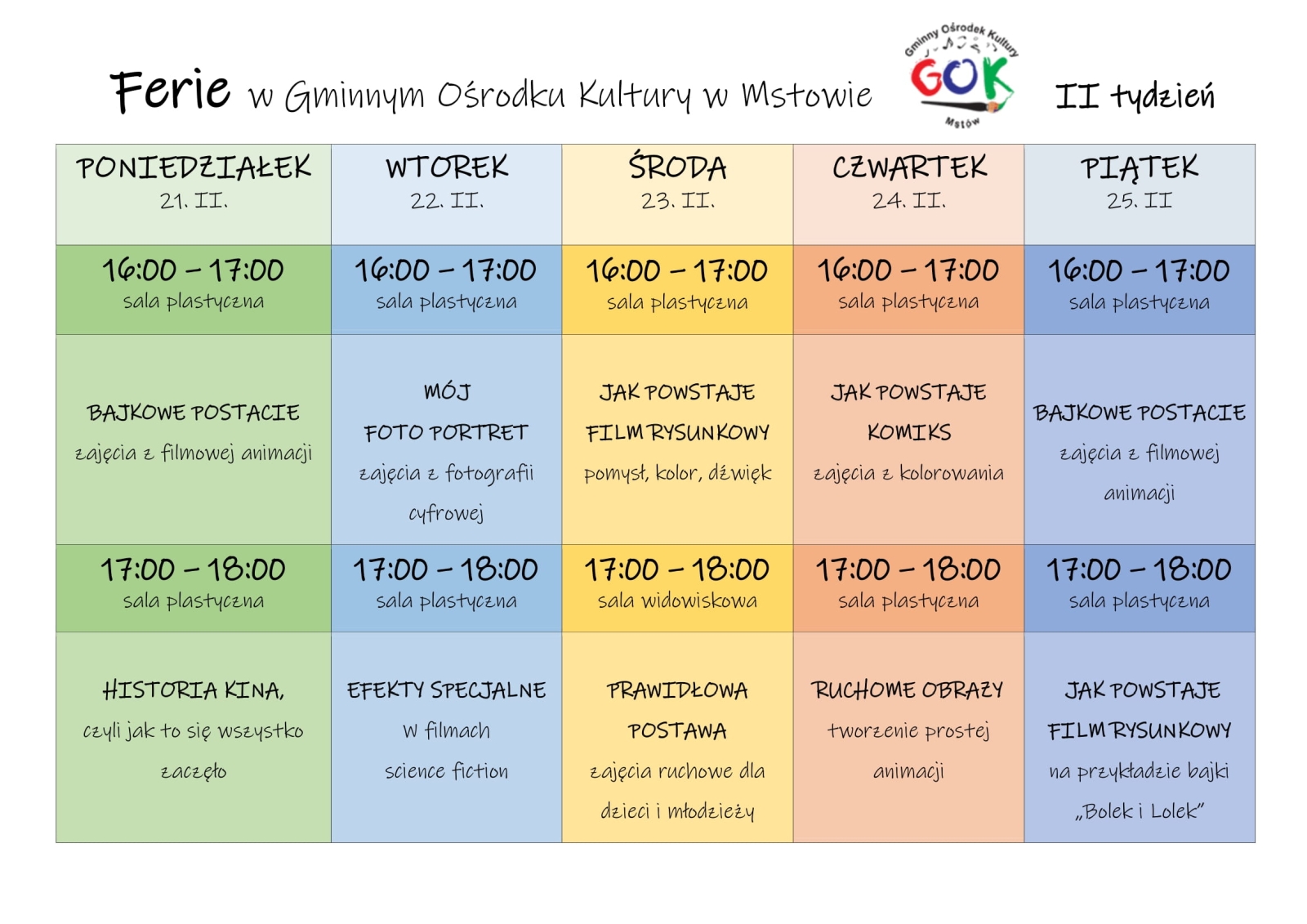 Na czas ferii szkolnych Gminny Ośrodek Kultury w Mstowie przygotował program zajęć dla różnych grup wiekowych, o urozmaiconych zainteresowaniach.