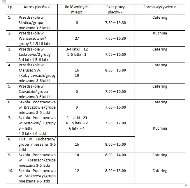 4. Na podstawie złożonych deklaracji o kontynuacji dyrektor ustala liczbę wolnych miejsc i podaje ją niezwłocznie do wiadomości organu prowadzącego. Na rok szkolny 2026/2027 Gmina Mstów dysponuje wolnymi miejscami tj.