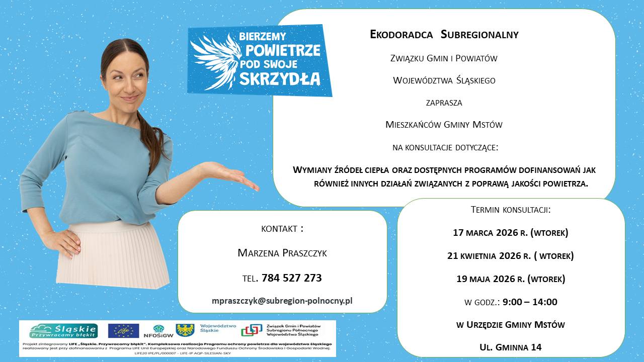 Ekodoradca Subregionalny Związku Gmin i Powiatów Województwa Śląskiego oraz Urząd Gminy Mstów zapraszają mieszkańców gminy na spotkanie informacyjne dotyczące wymiany źródeł ciepła i dostępnych programów dofinansowań.