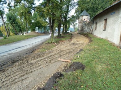 Zadanie finansowane jest w cyklu dwuletnim. Obecnie realizowany jest pierwszy etap budowy. Prace rozpoczęły się wzdłuż muru klasztornego. Mur od chodnika oddzielać będzie 1,5 m. pas zieleni. Dalej chodnik budowany będzie po drugiej stronie drogi.
